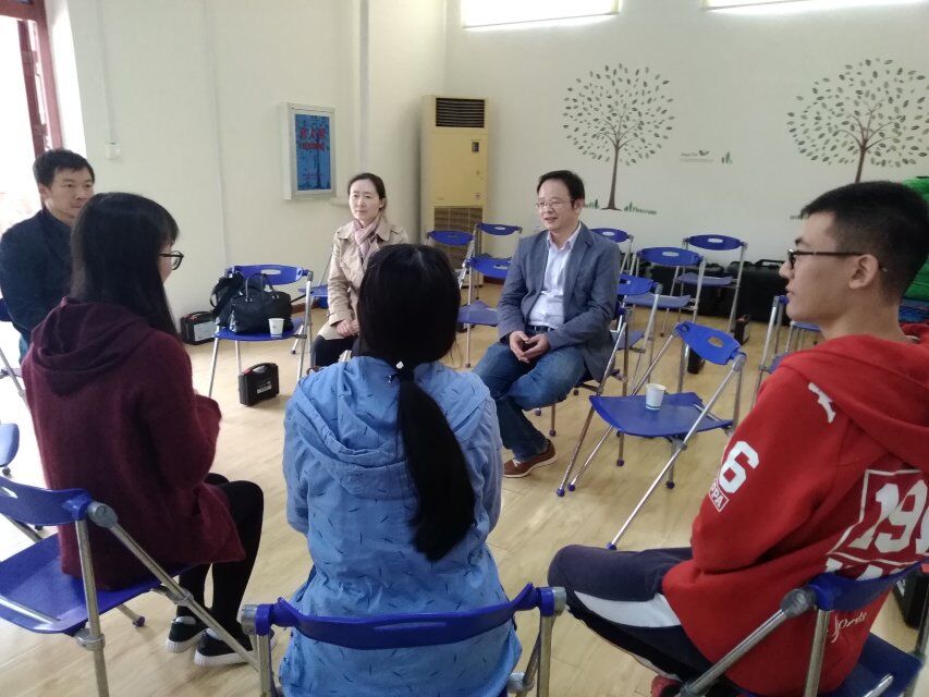 随后,孙院长、熊老师、曹非老师与实习小组的同学坐在团辅教室一起交流,听实习学生谈谈实习工作的困难、在实习过程之中的优点和需要再改进的地方。每个实习生都依次在会谈过程之中详细地谈了自己在已经过去的一个多月上课情况以及小组的活动情况,孙院长和熊老师认真倾听,作为“过来人”孙院长时不时还会提到自己以前实习期间的趣闻,引发同学很多思考。